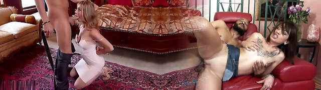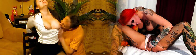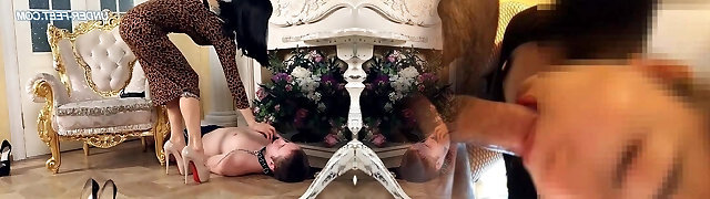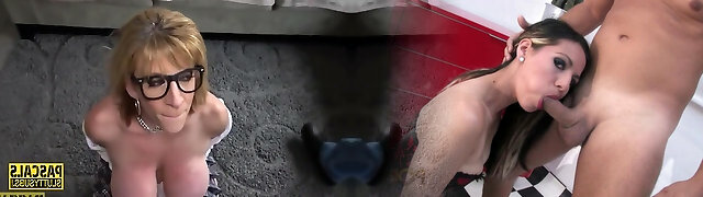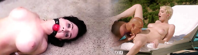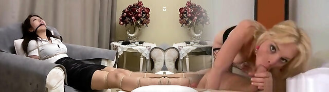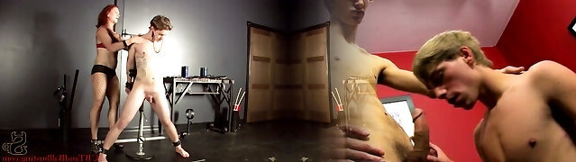 Sexy Chesty Blonde Milf Milks the Suspended Cock Of Her Sex-slave, Making Him Jizm In His Own Mouth