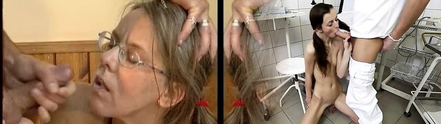 Insane ugly secretary Pauline squats down to suck two hot devices for sticky cum